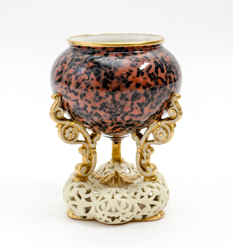 the speckled bowl raised on three gilt supports over the pierced base.