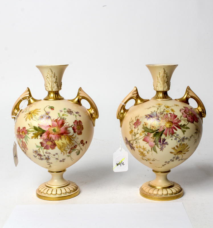 shape 2249, each of baluster handled form with polychrome floral decoration.