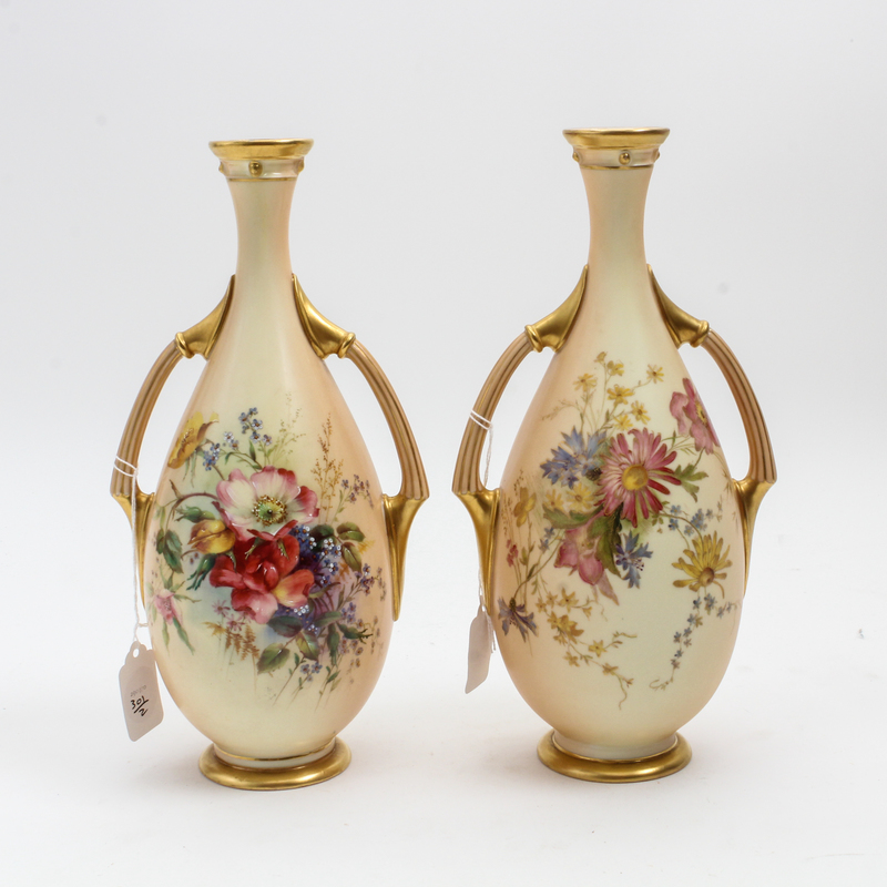 shape 2297, each of ovoid handled form with polychrome floral decoration.