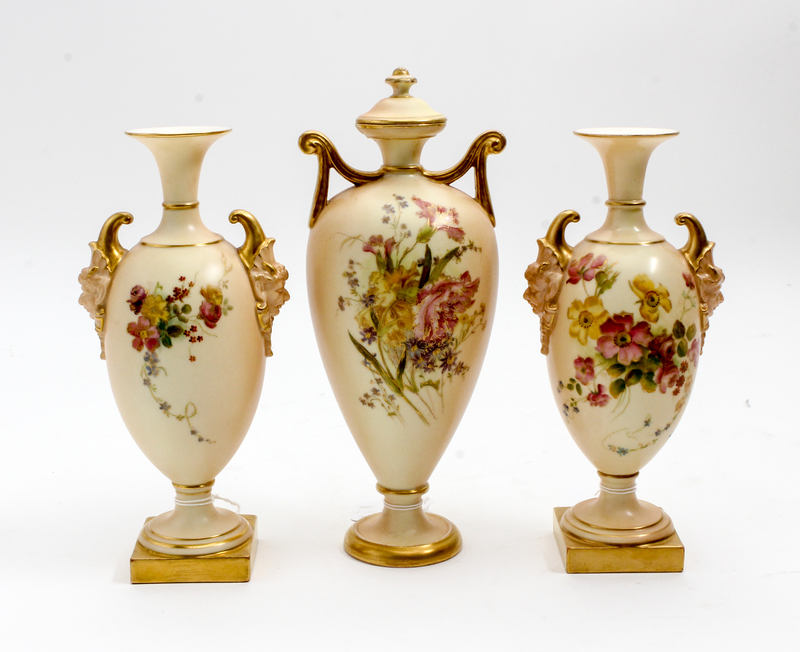 shapes 1716 & G962, comprising a pair of Royal Worcester vases of baluster form with mask handles and a Grainger vase of baluster form with scrolling handles and cover, each with polychrome floral decoration.