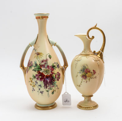 shapes H271 & 2297, comprising a Hanley ewer and a Royal Worcester vase, each of baluster, handled form with floral decoration.