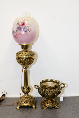 the ruffled shade with foliate decoration, the base with faux oil lamp fittings, together with another lamp base adapted as a jardiniere.