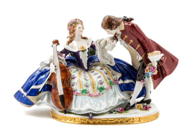 modeled to show a gentleman and lady in 18th century attire, raised on an oval base, with a Sitzendorf porcelain mark in underglaze blue to the underside.