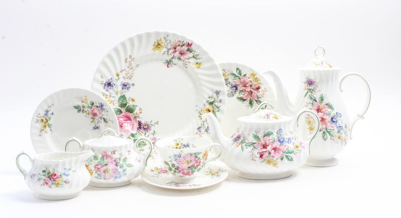 in the Arcadia pattern, comprising 11 dinner plates, 10 luncheon plates, 10 bread plates, 10 cups, 10 saucers, a coffee pot, a teapot, a covered sugar and a creamer.
