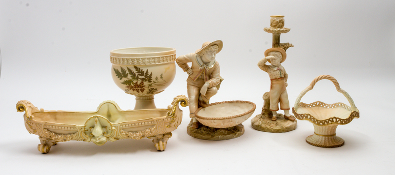 shapes 1080, 1141, 1177, 1390 & 1694, comprising a figural bowl, a figural candlestick, a basket, a jardiniere and a footed bowl.