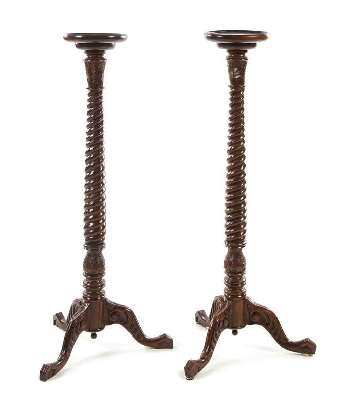 having an acanthus and barley-twist decorated stem on a tripartite base.