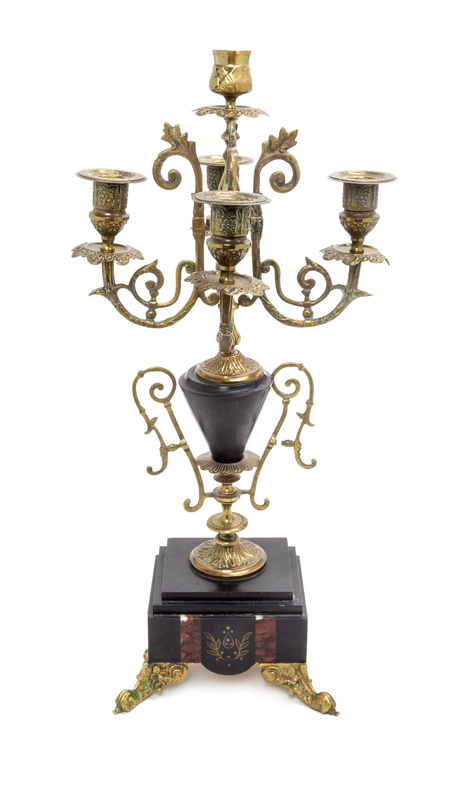 the handled urn form standard issuing the central candle cup and four foliate scroll candle arms, raised on a stepped slate plinth ending in scroll fore-feet.