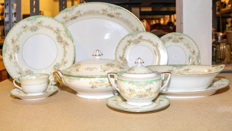 comprising 12 dinner plates, 12 salad plates, 12 soup bowls, 10 bread plates, 12 finger bowls, 10 cups and 11 saucers, a covered sugar, a sauce boat, a covered entree dish, 2 oval platters and an oval bowl.