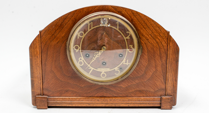 set in a wood case having a circular dial with Arabic numerals.