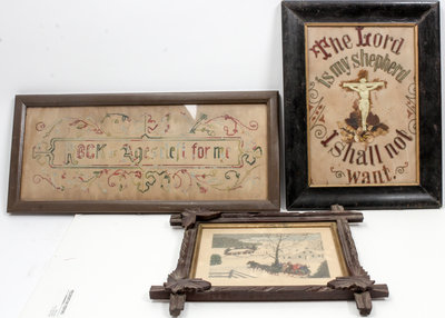 comprising three with religious subject matter and one Pull for the Shore; together with a print after Grandma Moses; each framed; five total.