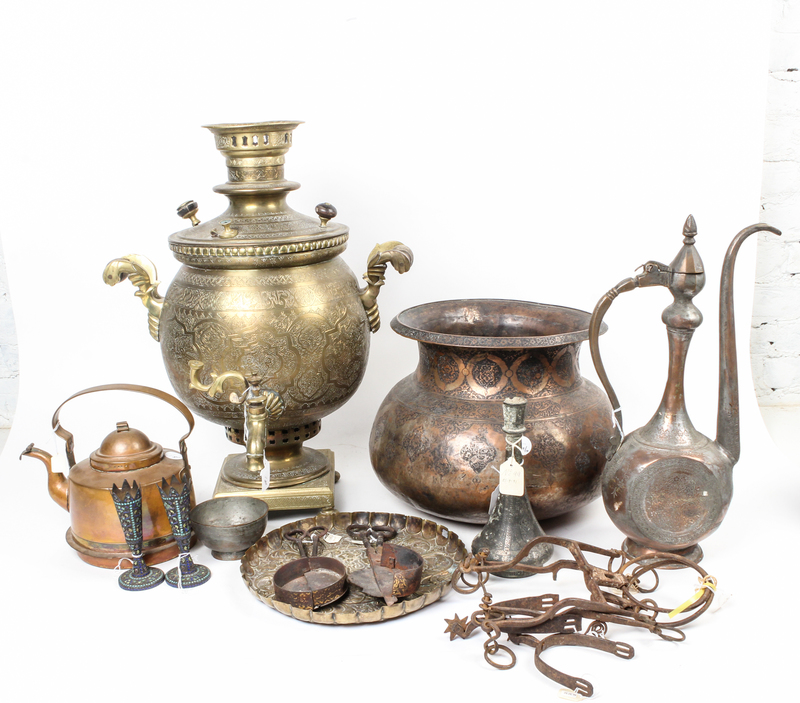comprising a brass samovar, copper bowl and others, 11 items total.