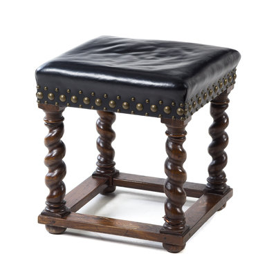 having a studded leather upholstered seat raised on barley twist legs joined by stretchers.