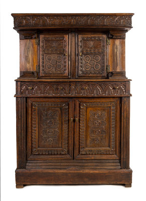 having a molded cornice and repeating foliate carved frieze above two paneled doors carved to show scrolled decoration, the lower case fitted with two drawers above two heavily carved paneled doors, raised on a bracket base.