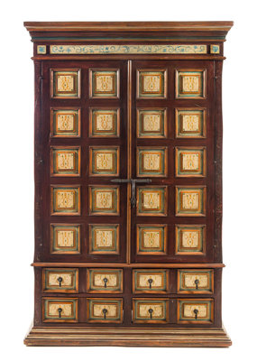 having a molded projecting cornice above the coffered body fitted with two doors opening to a shelved interior and four coffered drawers, raised on a molded plinth.