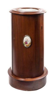 of cylindrical form, the molded top inset with white marble, the case fitted with a door opening to a shelved interior and inset with an oval porcelain plaque depicting a seated lady in a landscape.