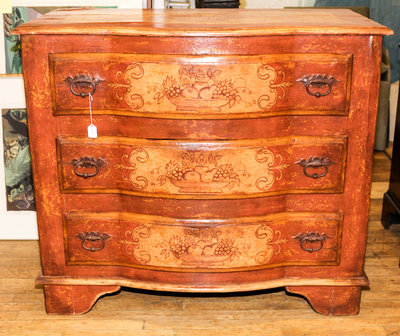 decorated with bowls of fruit, having a shaped top over three long drawers, the whole raised on ogee bracket feet.