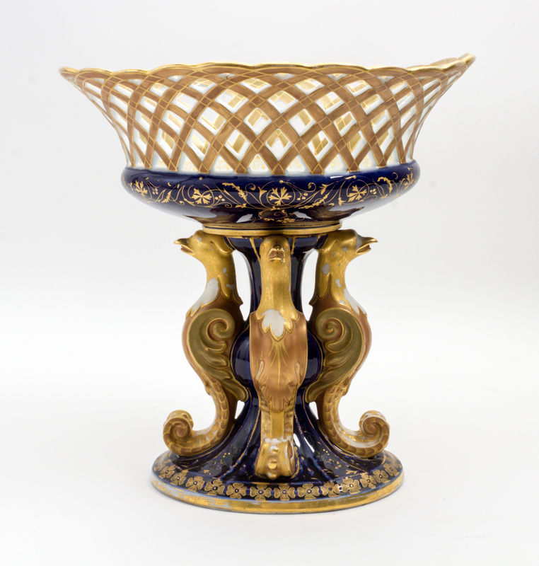 having a reticulated oval bowl raised on a conforming base with four stylized bird form supports, unmarked.
