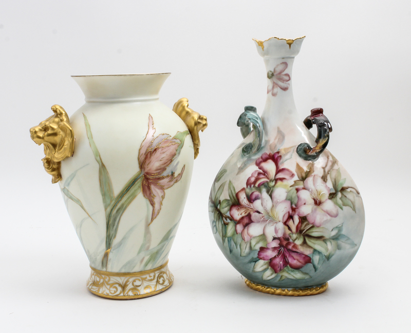 comprising a Jean Pouyat example of flattened bottle form with floral decoration and a Delinieres & Company vase with mask handles and tulip decoration.