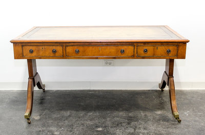 having a rectangular leather inset top over opposing sets of three drawers, raised on twin supports ending in brass caps and casters.