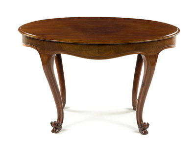 having a molded oval top above the undulating frieze, raised on cabriole legs ending in scroll feet.
