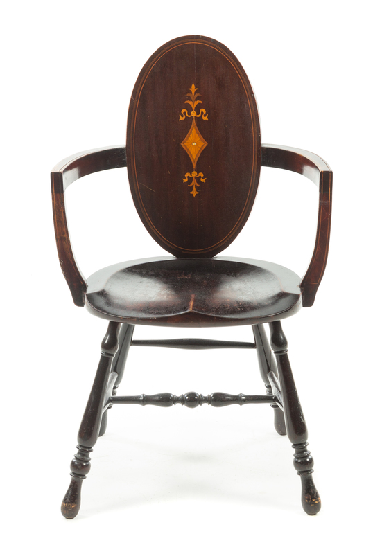 having an oval back inlaid to show a patera above the molded seat within open arms, raised on turned legs joined by an H-form stretcher.