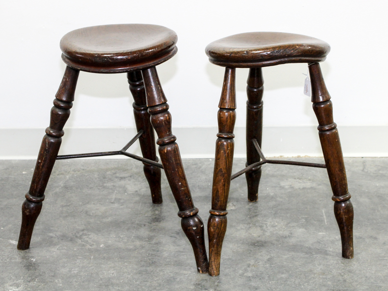 each with plank seat raised on turned legs joined by an iron Y-form stretcher.