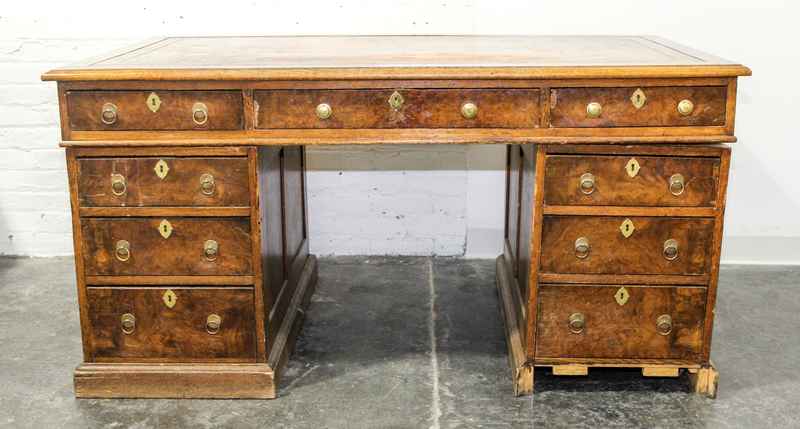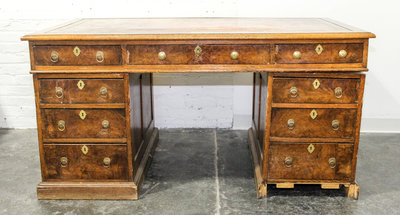 having a rectangular leather inset top over three drawers raised on twin pedestals each set with three drawers.