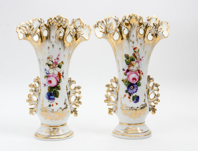 of flattened handled form with polychrome floral decoration and gilt highlights.