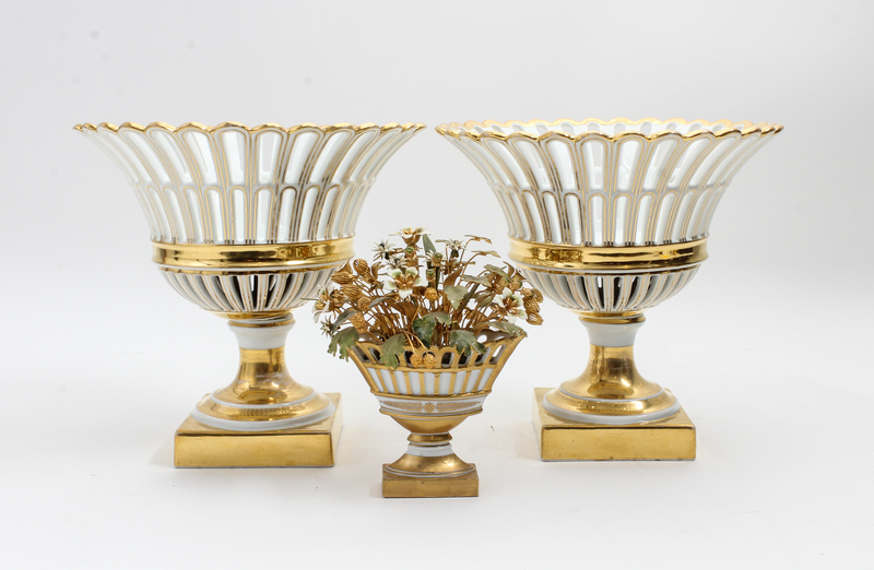 each with reticulated bowl and gilt decoration, together with a smaller example set with gilt metal flowers.