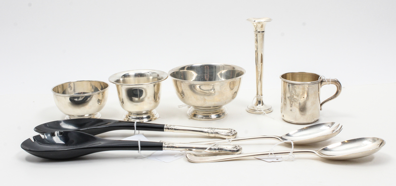comprising two Revere style bowls, two two-piece salad serving sets, a weighted trumpet-vase, a children's mug and a sugar bowl.