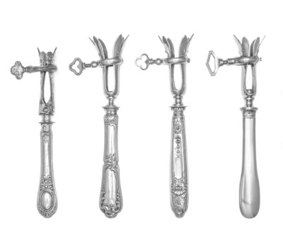 the handles decorated with ribbon and bellflower motifs, together with a French silver-plate example.