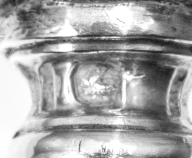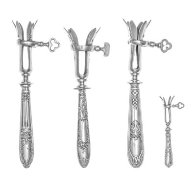 the handles worked to show floral and ribbon swags, comprising three standard sized examples and one diminutive example.