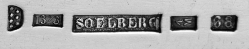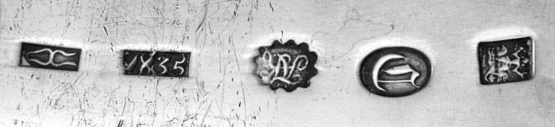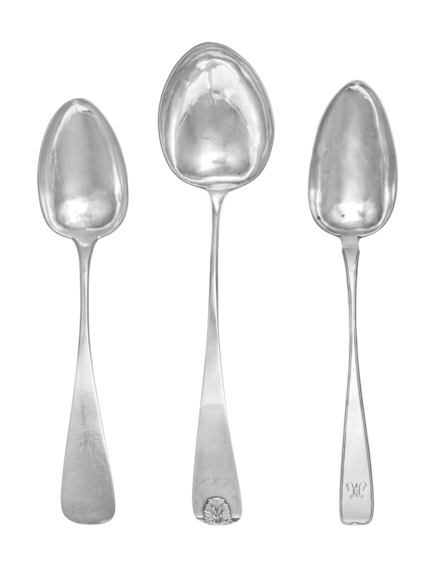 each having a downturned Hanoverian handle, one example with an applied acanthus motif at the end of the handle, one example with stippled floral and foliate motifs and one example with a reeded handle.