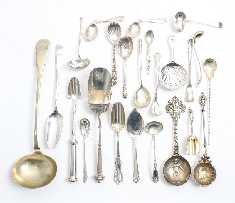 comprising sugar scoops, jelly spoons, cheese scoops, nut scoops and others, 24 total.