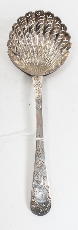 having a pierced, shell-form bowl, the handle decorated with bright-cut floral, foliate and volute motifs.