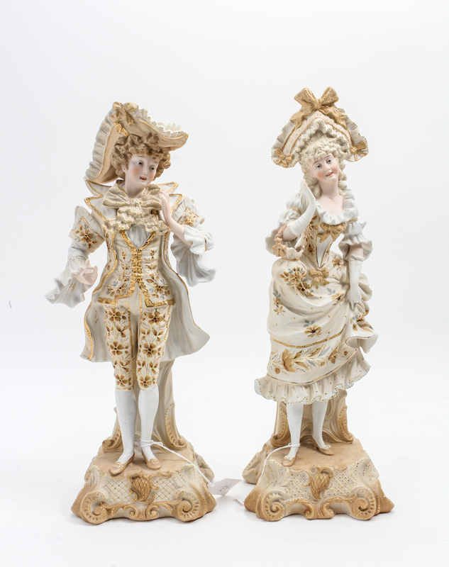 depicting a lady and a gentleman in 18th century attire, with gilt highlights, unmarked.