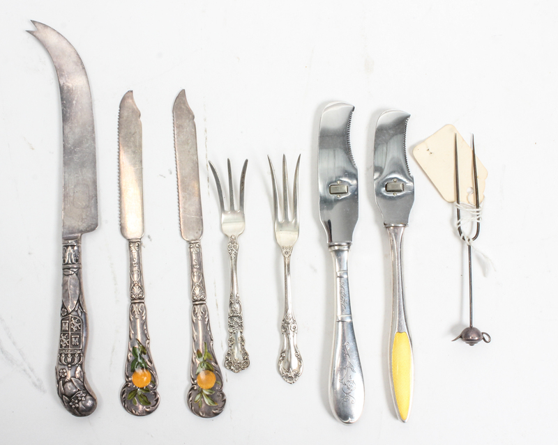 comprising three silver-handled cheese knives, two lemon forks, two enamel decorated fruit knives and an unmarked lemon tine with a teapot finial.