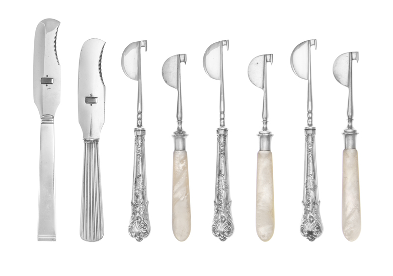 having silver, silver-plate, ebony and mother-of-pearl handles.