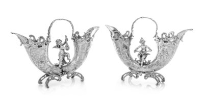 the U-form vases worked with rocaille and foliate rims, the bodies decorated with scenes of courting couples, the base supporting the figure of a cherub and raised on four C-scroll and foliate decorated feet.