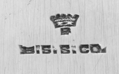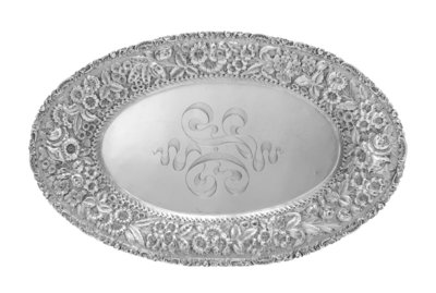 having a foliate and volute decorated rim, the border worked with repousse floral and foliate decoration, the field with an engraved monogram 'H'.