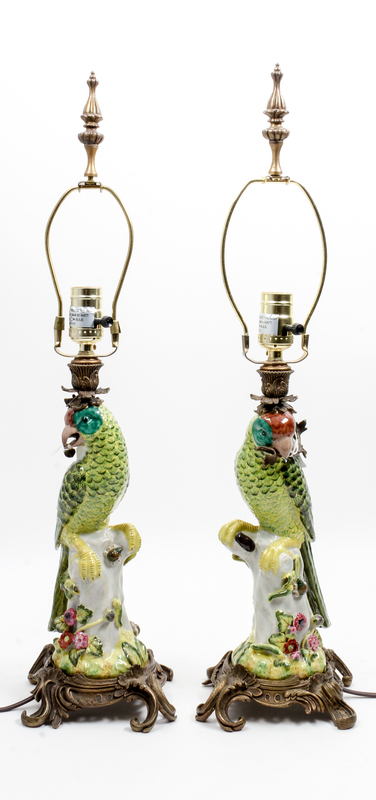 each in the form of a perched parrot, set in rococo gilt metal mounts.