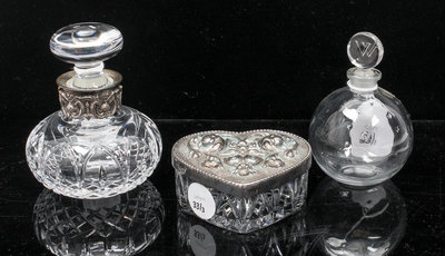 including a silver-plate mounted heart-shaped box, together with a Lalique glass perfume bottle.