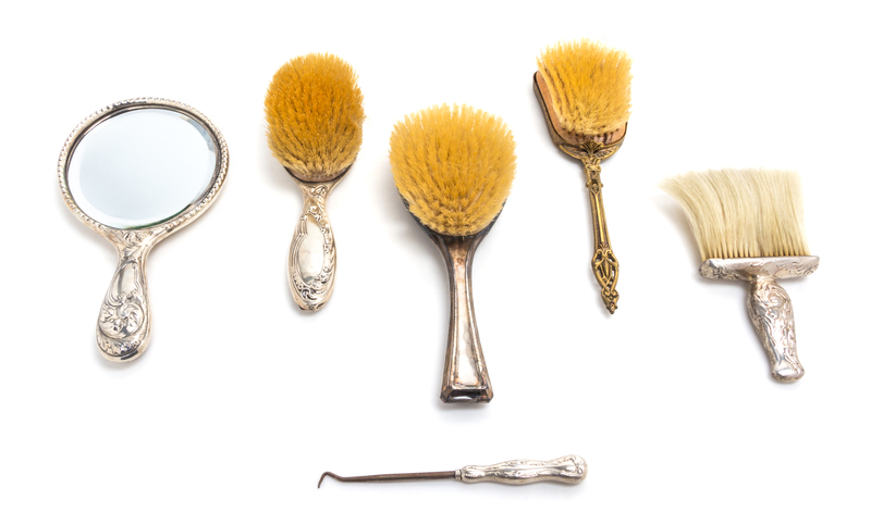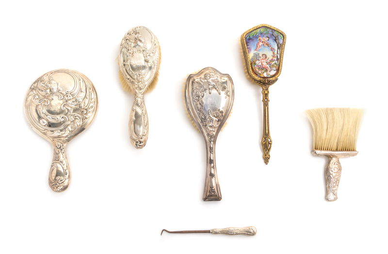 comprising a brush, a hand mirror, a powder brush and a button hook, together with two additional brushes.