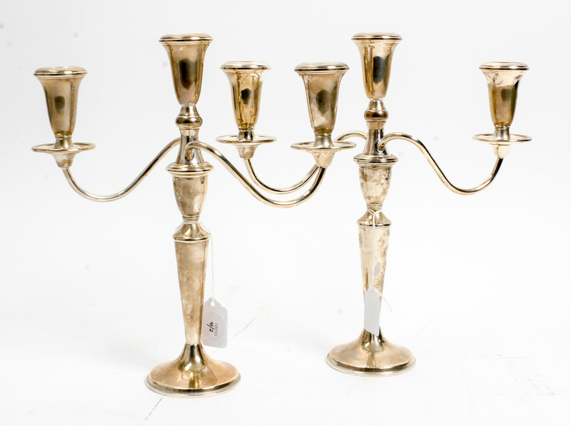 the baluster form stem issuing the central candle cup and the two scrolling candle arms, raised on a circular foot, weighted.