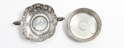 comprising a twin-handled Austrian example with a scalloped body, the base with an inset 1780 Austrian silver thaler coin, together with a Continental example with a base having an inset Ottoman silver coin.