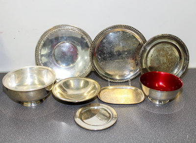 comprising two Reed & Barton bowls, a Reed & Barton tray, three smaller trays, two bread plates and a bowl; 9 total.