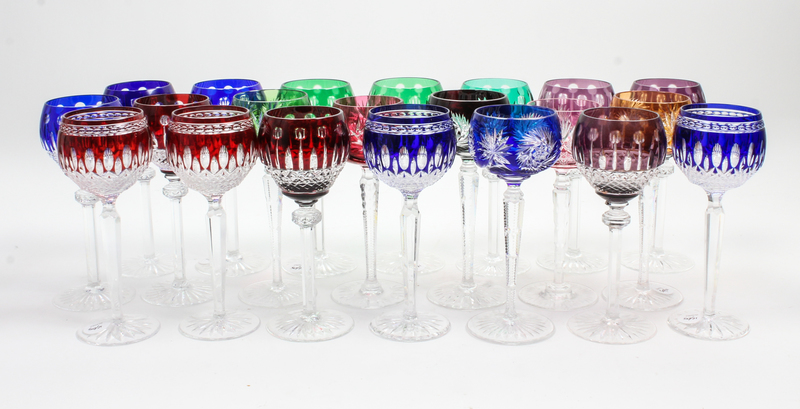 comprising four Waterford examples, eleven with linear cut decoration and six with pinwheel decoration, in a variety of colors; 21 total.