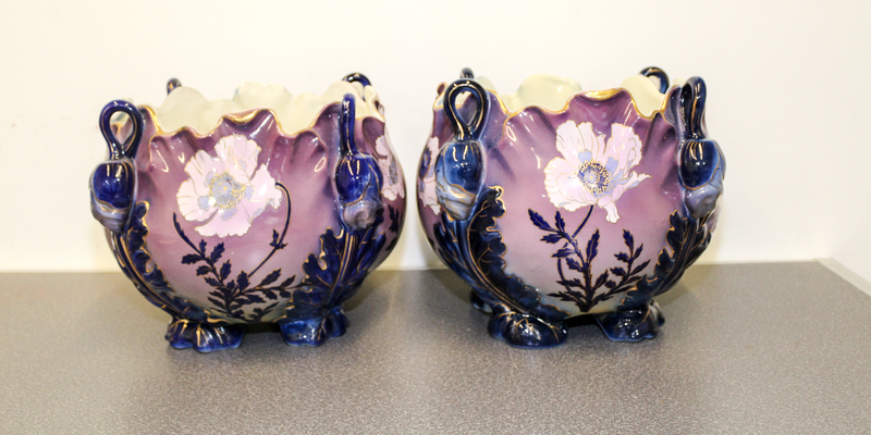 the exteriors decorated with applied polychrome floral and vine motifs with gilt decorated rims.