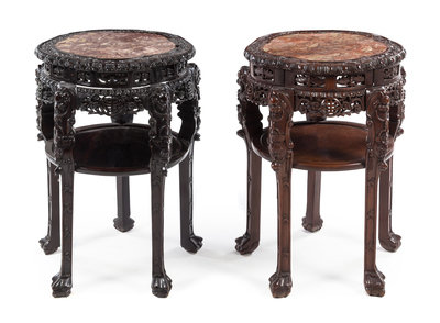 Two Chinese Marble Inset Hardwood Stands