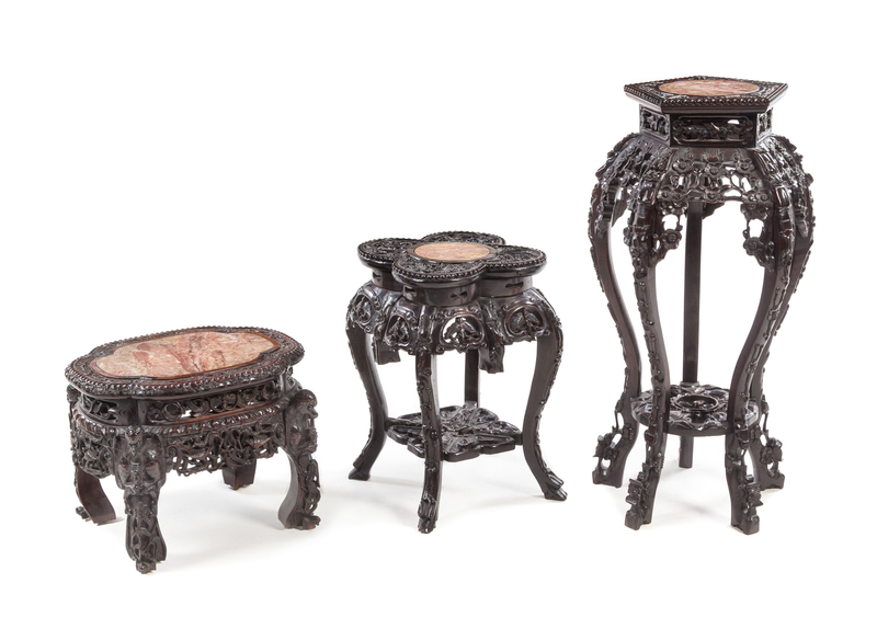 Three Chinese Marble Inset Hardwood Stands